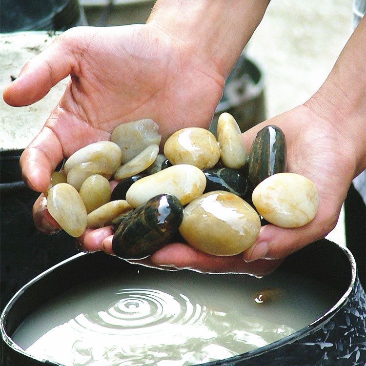 Galets de mer ou de rivière, naturels, roulés ou polis.